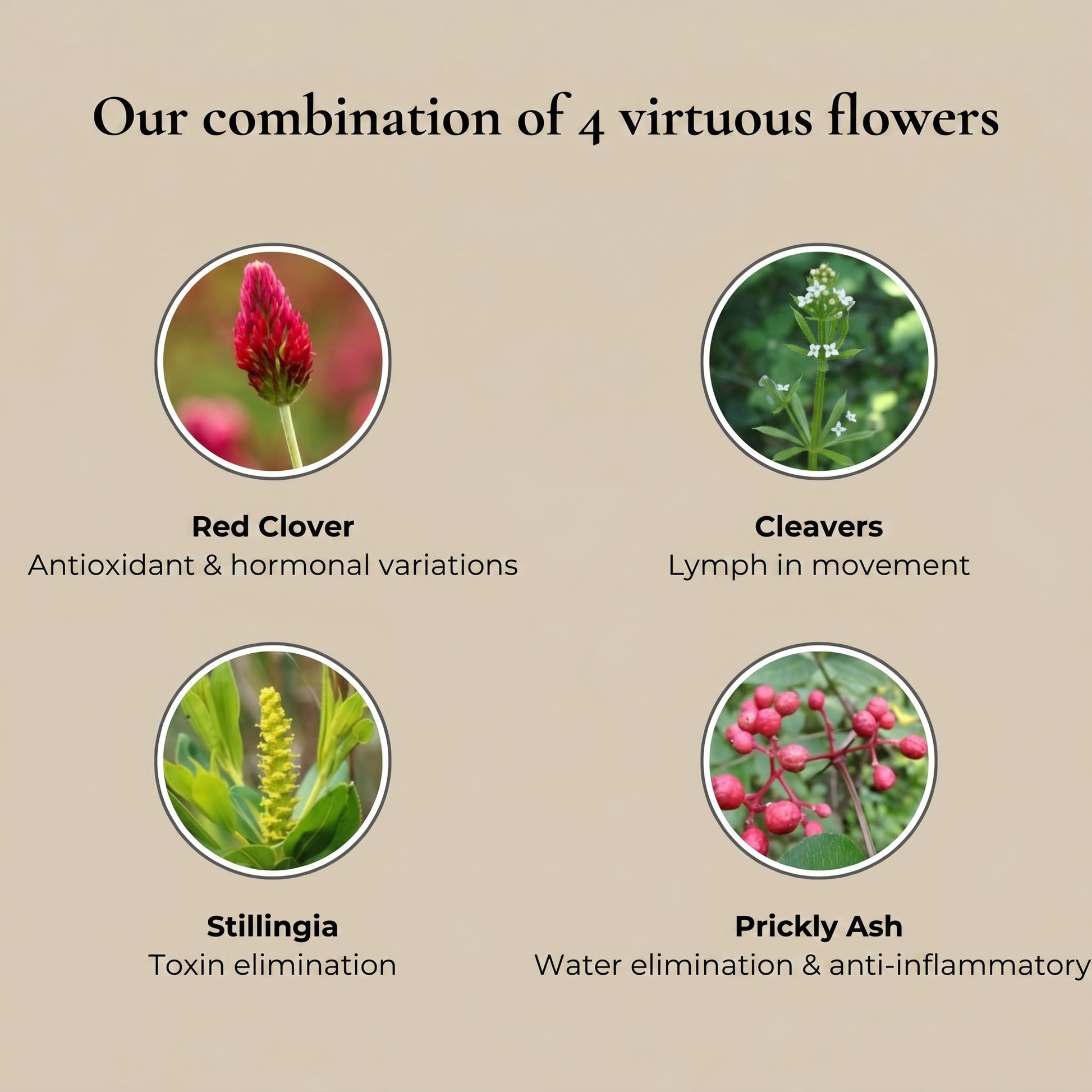 So we went back. Traditional European herbalism. Four botanicals used for generations to "put the humors back in motion" cleavers, red clover, prickly ash, stillingia. We combined them into a liquid sublingual synergy at clinical dosages. No filler. No proprietary blend hiding weak doses. No marketing jargon dressed up as science.